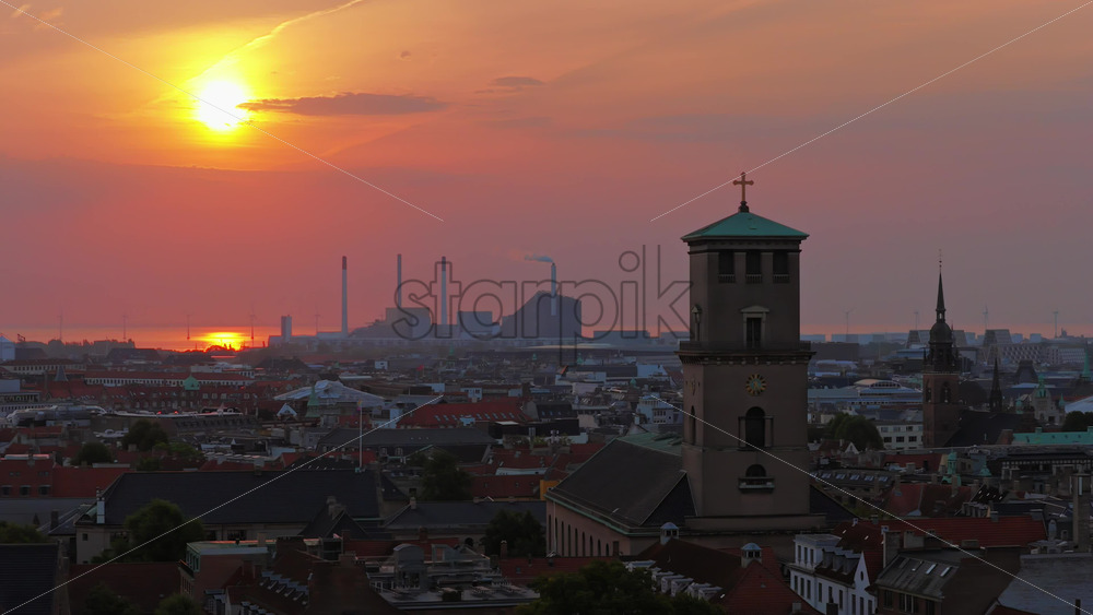Copenhagen, Denmark – August 3, 2025: Aerial drone view of CopenHill chimneys with smoke rising against the orange sunrise sky in Copenhagen, Denmark Royalty Free Stock Video Footage