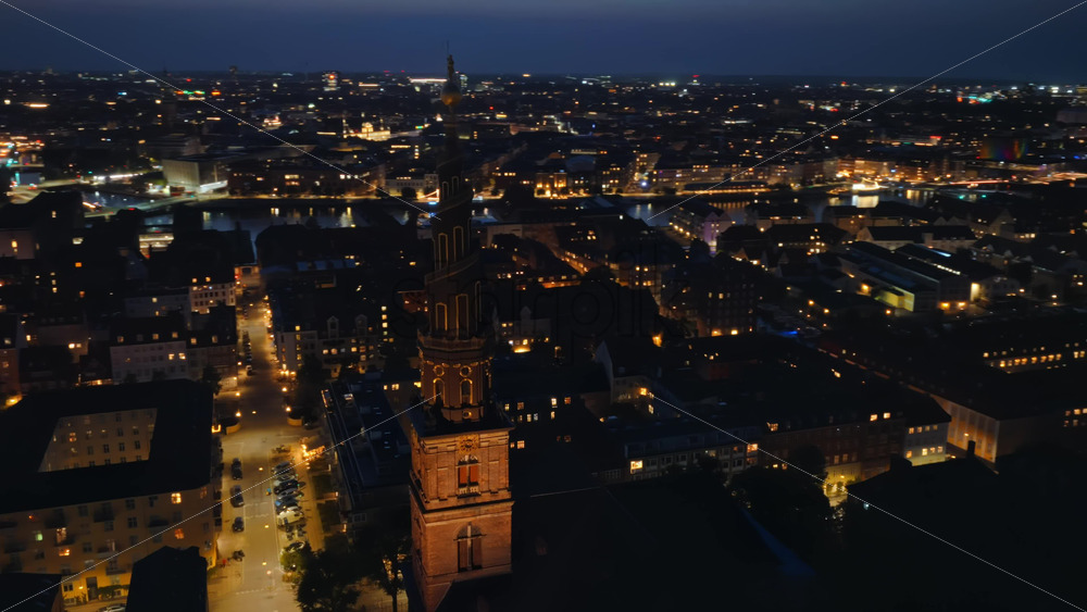 Copenhagen, Denmark – August 6, 2025: Aerial drone view of Copenhagen City Hall and its clock tower, with lively city streets glowing with lights and traffic below at night. Vertical Royalty Free Stock Video Footage
