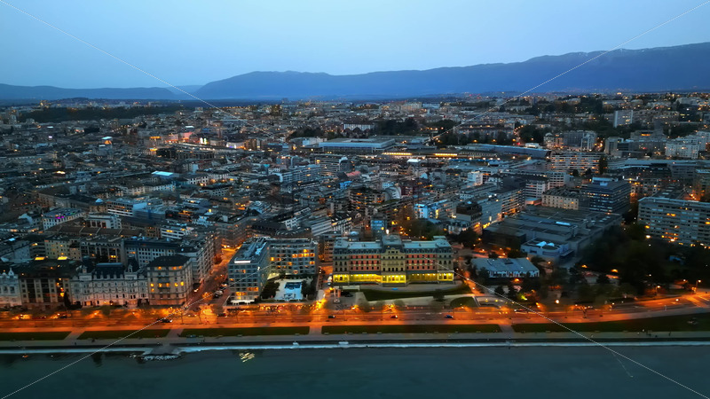 VIDEO Aerial, drone view of the streets and buildings of Geneva, Switzerland in the evening Royalty Free Stock Video Footage