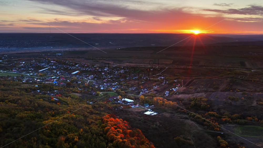 Aerial drone view of the sun setting over a Moldovan village surrounded by farmlands Royalty Free Stock Video Footage