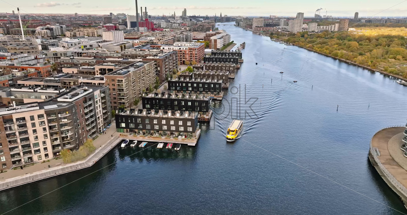 Video Aerial drone view of a yellow boat moving on the water in the Teglholmen peninsula in the South Harbour of Copenhagen, Denmark Royalty Free Stock Video Footage