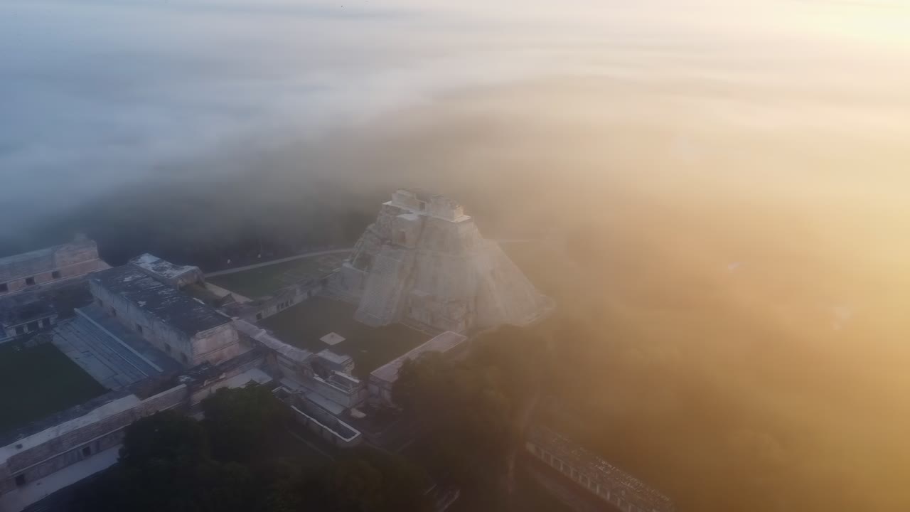 Video – Aerial drone view of the Temple of the Inscriptions at Palenque archaeological site emerging through morning mist in the Chiapas jungle, Mexico, showing ancient Mayan ruins surrounded by dense rainforest