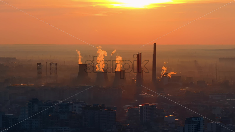 VIDEO Aerial drone view of thermal power stations in Bucharest at sunset. Flying birds. Romania Royalty Free Stock Video Footage