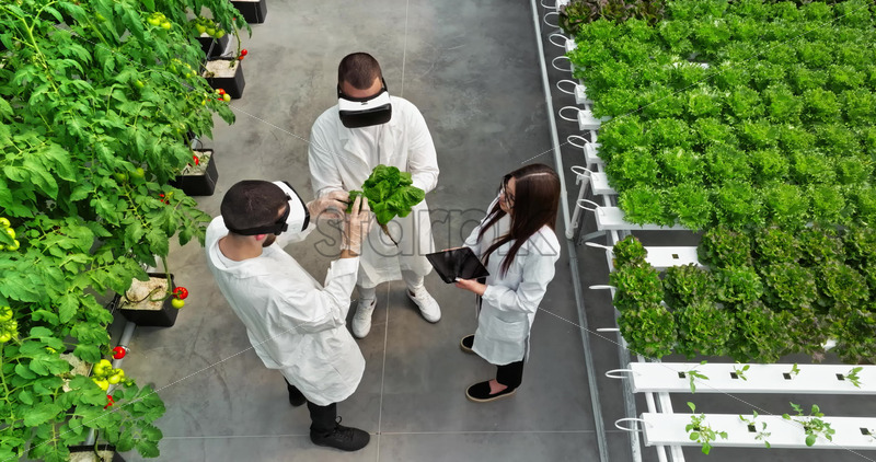 VIDEO Three laboratory technicians in white coats wearing Virtual Reality headsets, analysing lettuce grown with the Hydroponic method in a greenhouse Royalty Free Stock Video Footage