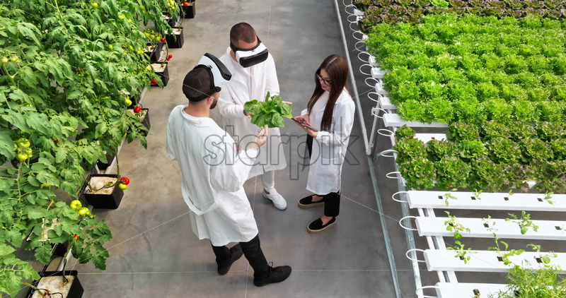 VIDEO Three laboratory technicians in white coats wearing Virtual Reality headsets, analysing lettuce grown with the Hydroponic method in a greenhouse Royalty Free Stock Video Footage