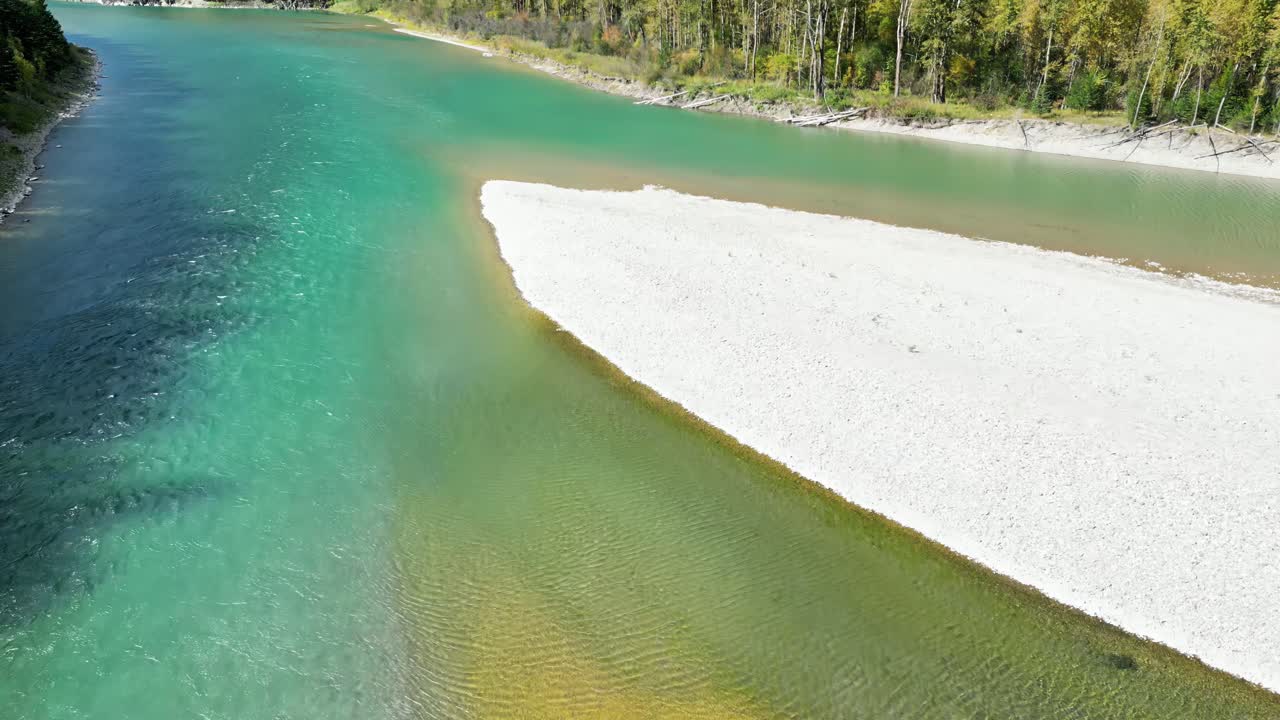 Aerial drone view of turquoise river flowing around white sandbar with forested shoreline Royalty Free Stock Video Footage