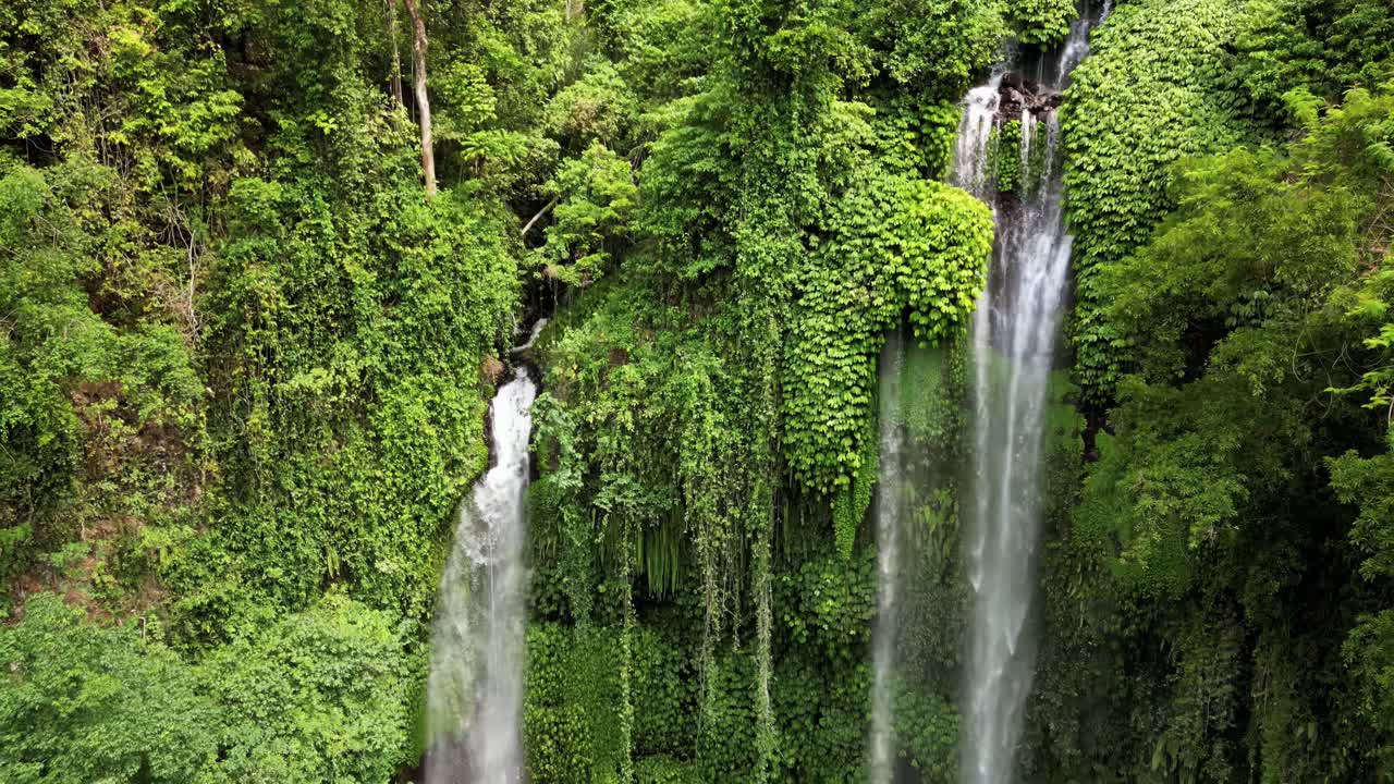 Video – Aerial drone view of twin waterfalls cascading down a steep jungle cliff at Sekumpul Waterfall, Buleleng, Bali. White water streams contrast with deep green rainforest vegetation