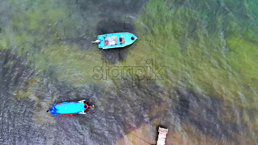 Aerial drone view of two moored boats in transparent water of the Aegean sea. Greece Royalty Free Stock Video Footage