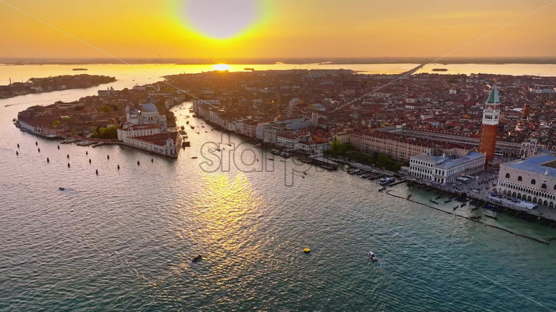 VIDEO Aerial drone view of boats moving near Venice City, Italy, at sunset Royalty Free Stock Video Footage