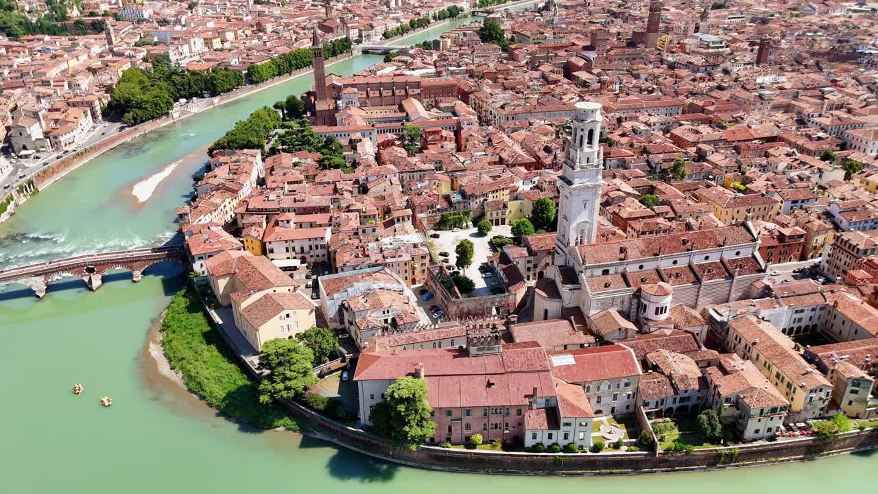 Aerial drone view of Verona Cathedral and the dense historic center with terracotta rooftops along the Adige River in northern Italy. Royalty Free Stock Video Footage