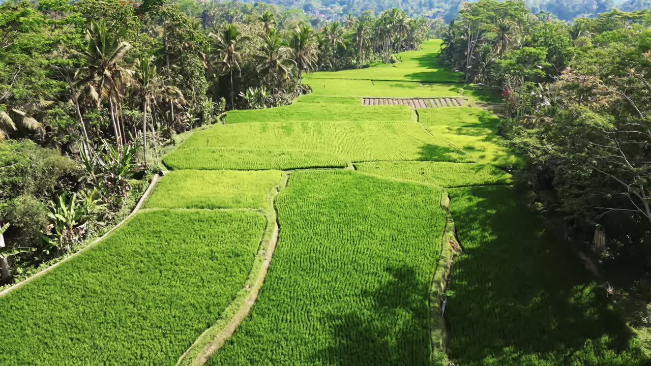 Aerial drone view of vibrant green rice paddies near Ubud, Bali, Indonesia. Rectangular agricultural plots divided by narrow paths and irrigation lines under warm tropical sunlight Royalty Free Stock Video Footage