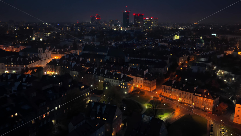 Aerial drone view of Warsaw’s Old Town toward the Srodmiescie district, with bright city lights and residential buildings visible below Royalty Free Stock Video Footage