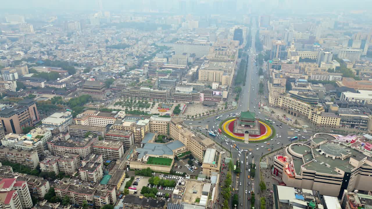 Aerial drone view of Xi’an Bell Tower located in central Xi’an, Shaanxi Province, China. Iconic traditional Chinese tower stands in the middle of a large circular intersection surrounded by city buildings and traffic Royalty Free Stock Video Footage