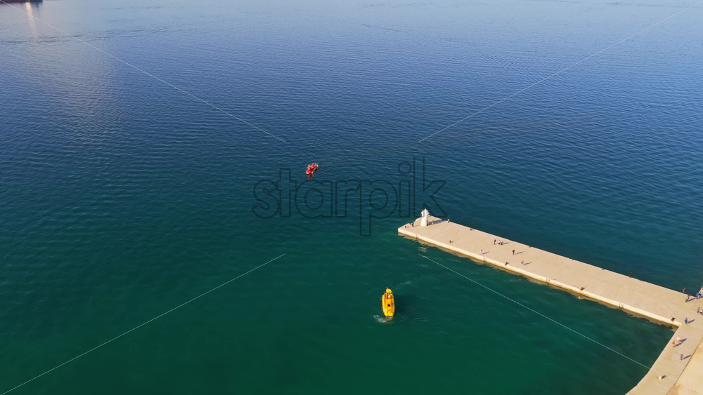 Aerial drone view of the long pedestrian bridge connecting parts of Zadar over deep blue harbor waters Royalty Free Stock Video Footage