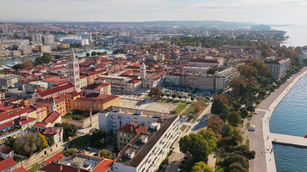 Aerial drone view of Zadar’s historic seafront with bright Adriatic waters, elegant stone buildings, red rooftops, palm trees, and people walking along the promenade Royalty Free Stock Video Footage
