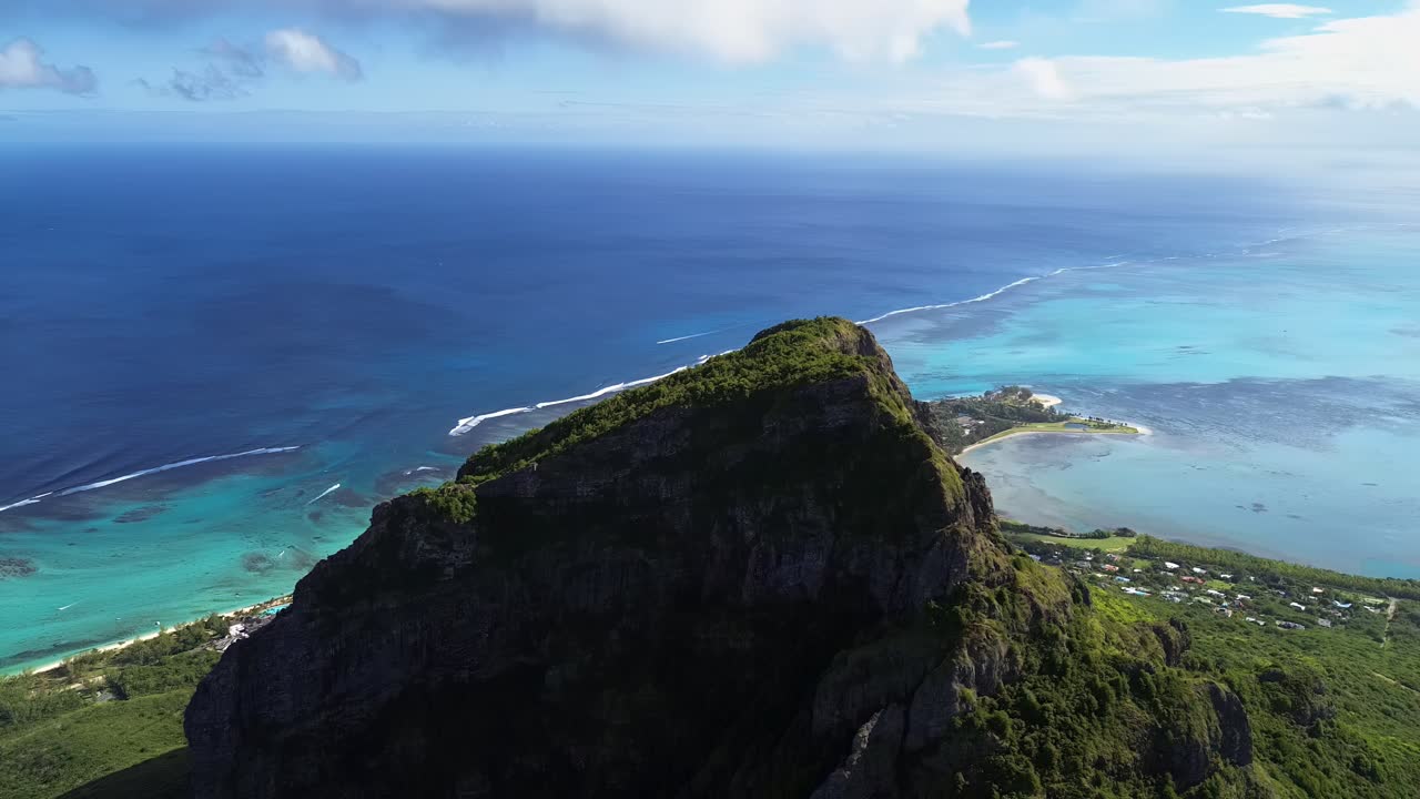 Aerial drone view past Le Morne Brabant mountain in Mauritius, overlooking the turquoise lagoon and coral reefs of the Indian Ocean Royalty Free Stock Video Footage