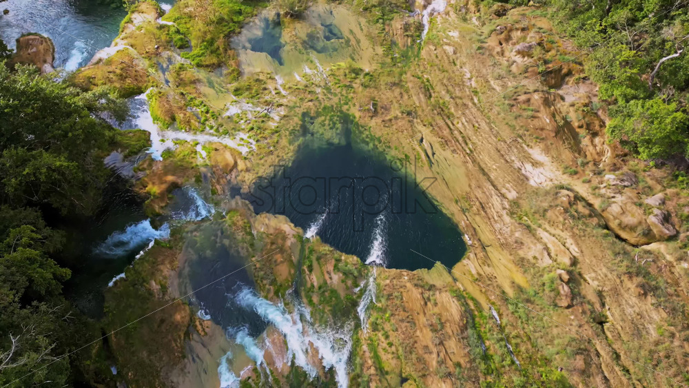 Aerial drone view showing a waterfall flowing into a deep blue basin surrounded by rock formations and vegetation Royalty Free Stock Video Footage
