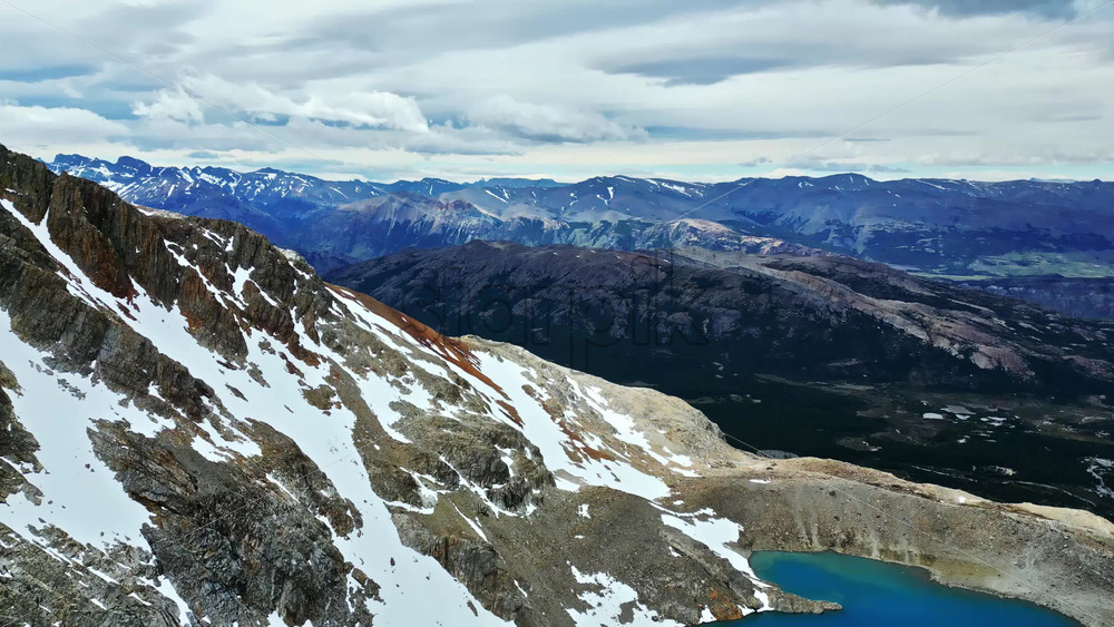 Aerial drone view of a turquoise mountain lake surrounded by rugged terrain and snowfields beneath the Fitz Roy massif. Vertical Royalty Free Stock Video Footage