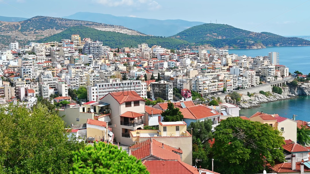 Aerial view of Kavala. Rows of residential buildings, Aegean sea rocky coast, road with cars, viaduct, hills on the background. Greece Royalty Free Stock Video Footage
