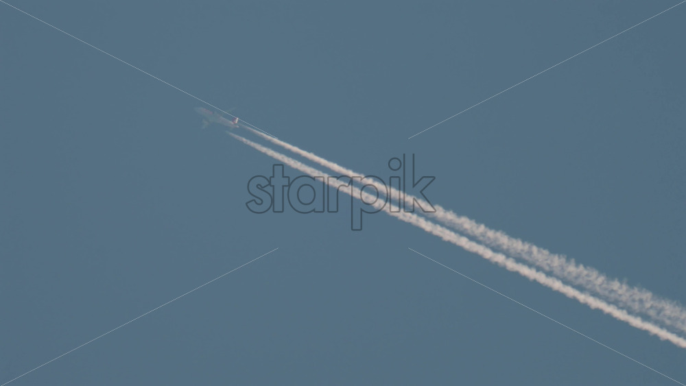 Airplane flying high above leaving long contrails in a clear blue sky Royalty Free Stock Video Footage