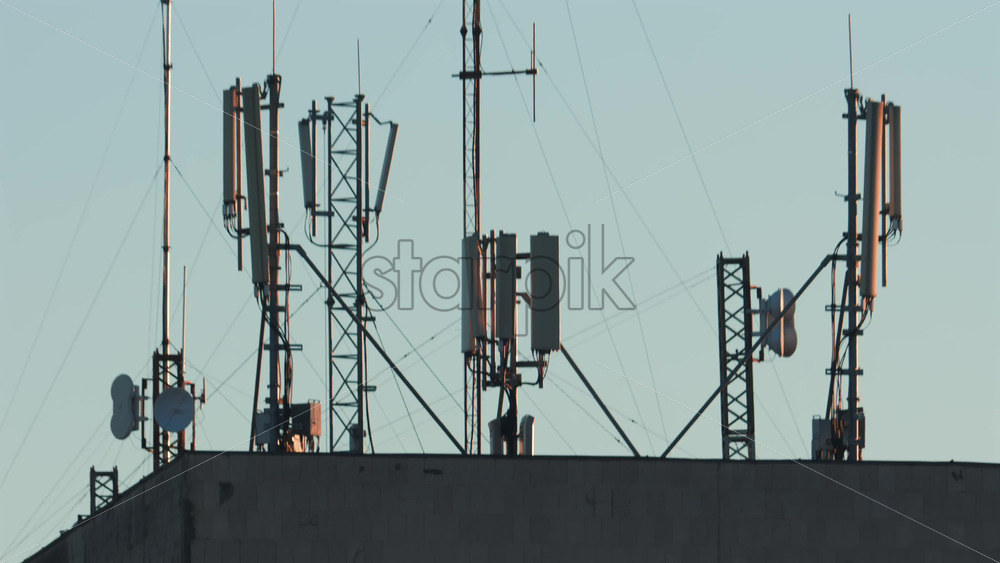 Antennas and communication towers stand on top of a building under the warm morning light Royalty Free Stock Video Footage
