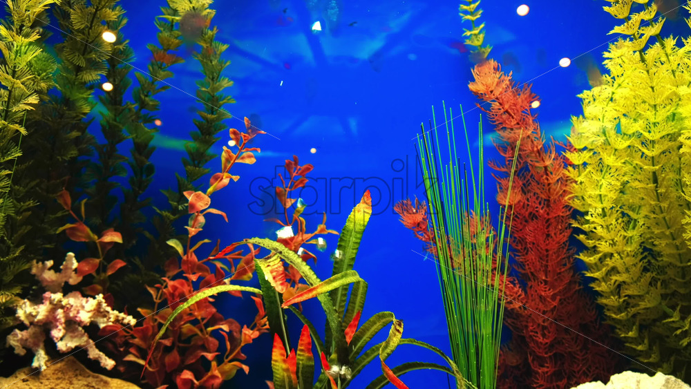 Aquarium with artificial plants, blue wall and bubbles Royalty Free Stock Video Footage