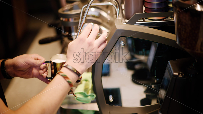 VIDEO Barista foaming the milk at a coffee shop Royalty Free Stock Video Footage