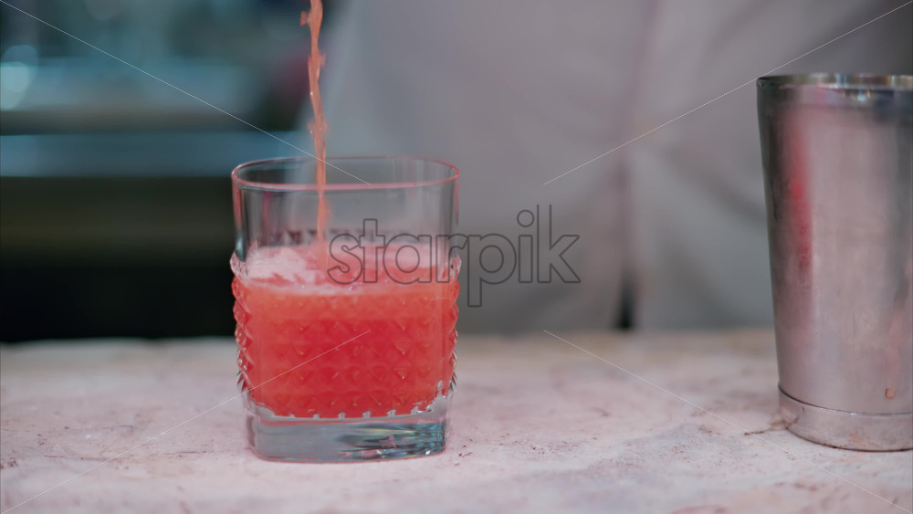 Barman making a cocktail with bitter alcohol at the bar at night with red neon lights, slow motion Download royalty free stock video footage Royalty Free Stock Video Footage