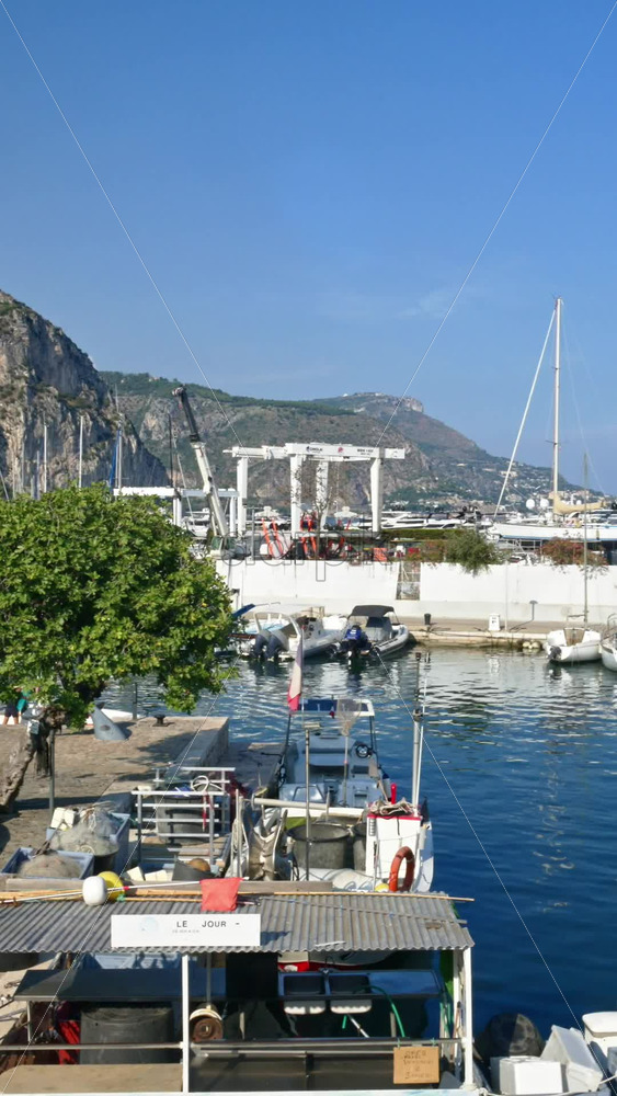 Beaulieu-sur-Mer, France – July 5, 2024: Boats docked in the port with the mountains on the background. Vertical Royalty Free Stock Video Footage