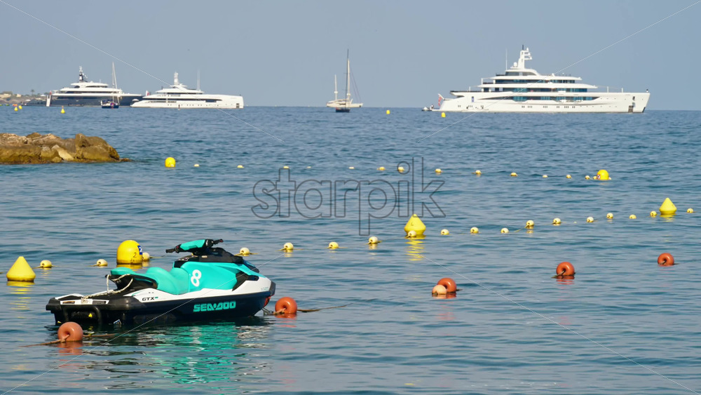 Beaulieu-sur-Mer, France – July 5, 2024: Turquoise Jet Ski on the sea, with boats docked on the background Royalty Free Stock Video Footage