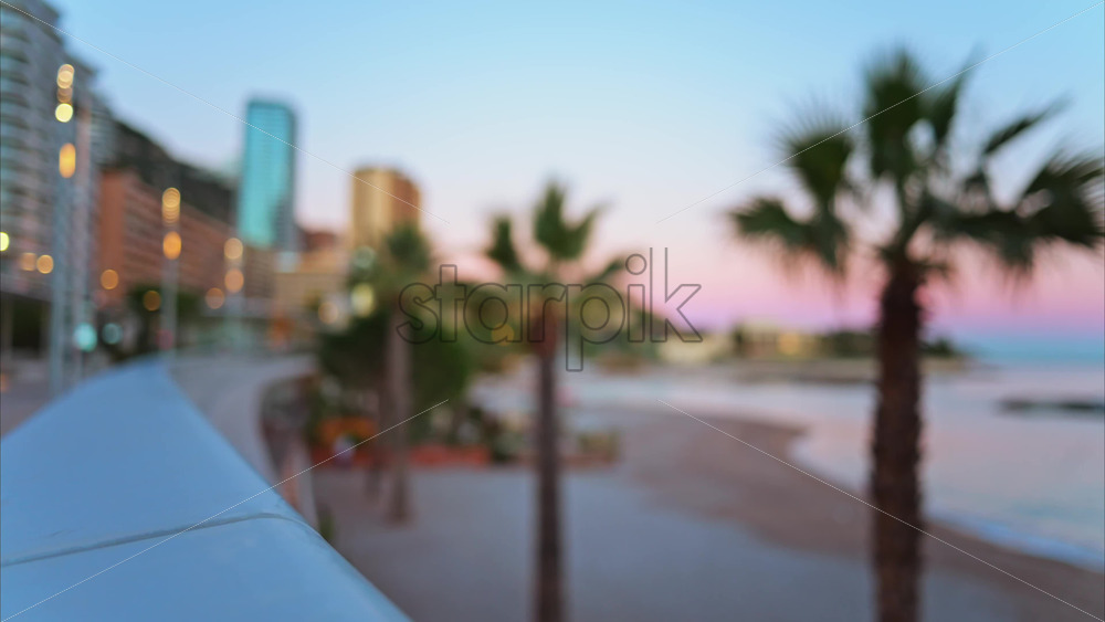 Alicante, Spain – June 20, 2025: Aerial drone view of palm trees on the beach and buildings near the coastline of the city at sunset Royalty Free Stock Video Footage