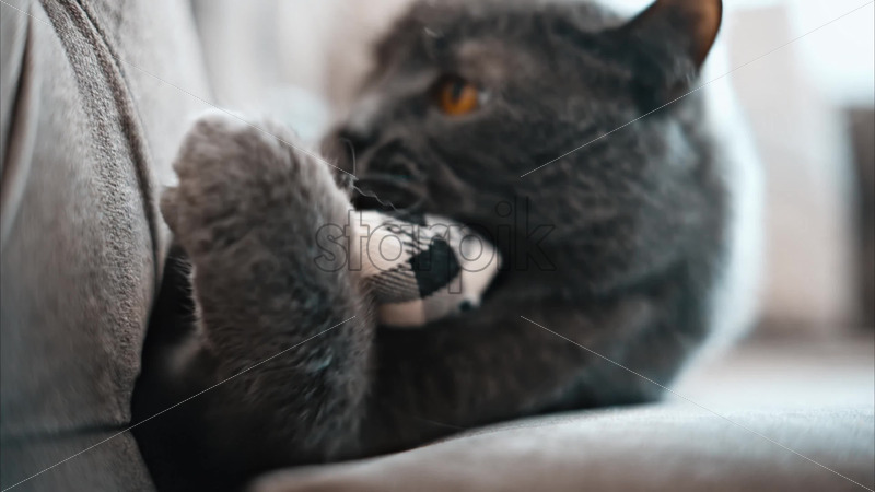 VIDEO British Shorthair cat with orange eyes lying on the couch, with a toy in it’s paws Royalty Free Stock Video Footage