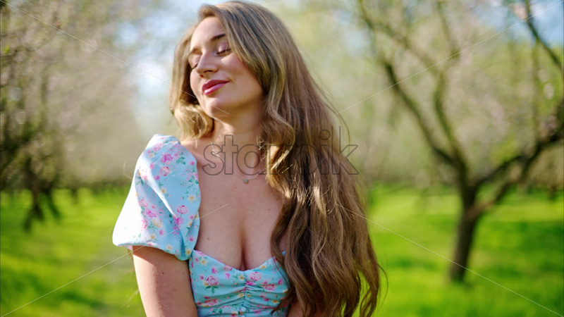 VIDEO Brunette woman in a blue dress smelling a flower in a field of blooming almond trees Royalty Free Stock Video Footage