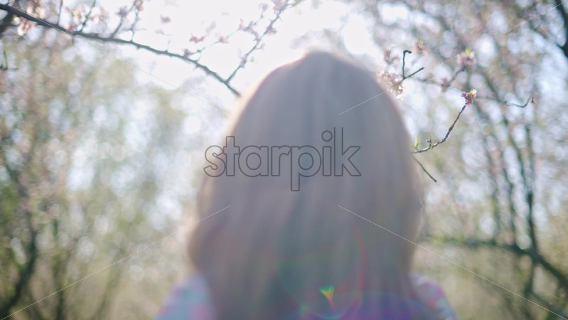 VIDEO Brunette woman in a blue dress smelling a flower in a field of blooming almond trees Royalty Free Stock Video Footage