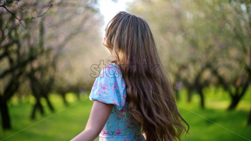 VIDEO Brunette woman in a blue dress spinning in a field of blooming almond trees Royalty Free Stock Video Footage