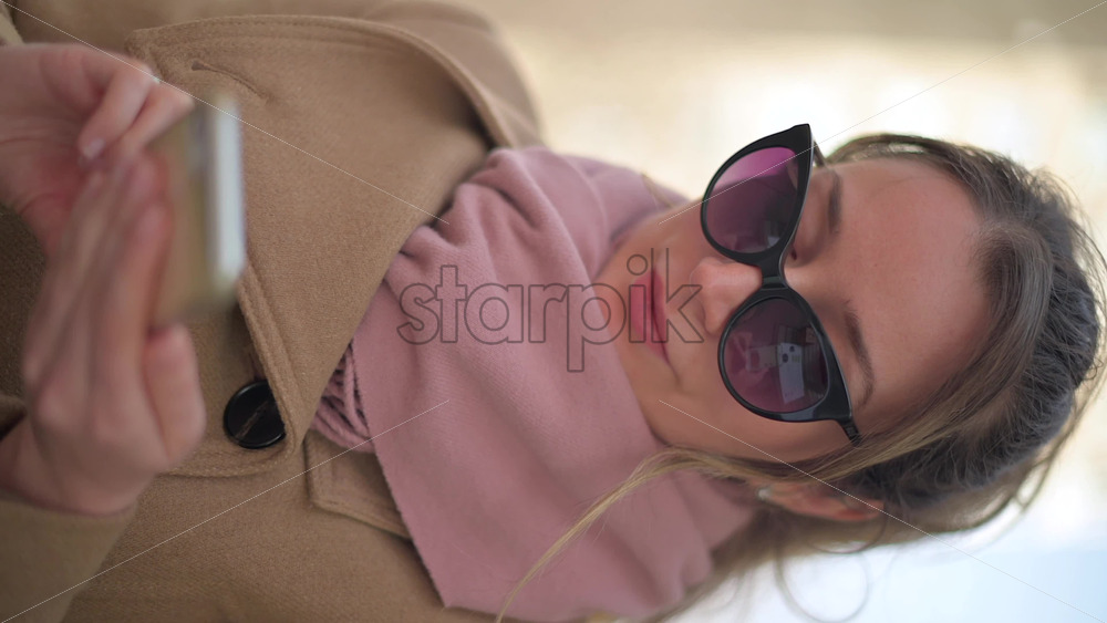 Brunette woman wearing a brown coat scrolling on her phone at a terrace. Vertical Royalty Free Stock Video Footage