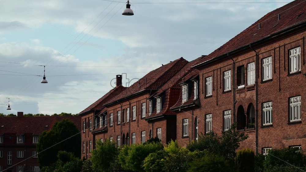 Building facade featuring red brick walls and many windows under a cloudy sky. Copenhagen, Denmark Royalty Free Stock Video Footage