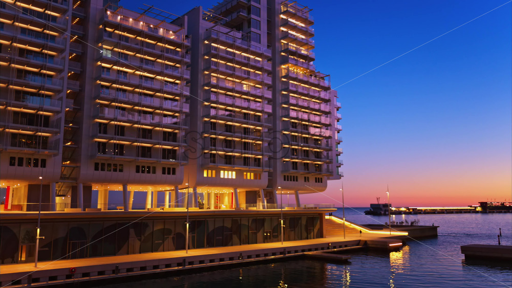 Modern residential buildings showing striking lime green and pastel green facades with geometric cube balconies. Copenhagen, Denmark Royalty Free Stock Video Footage