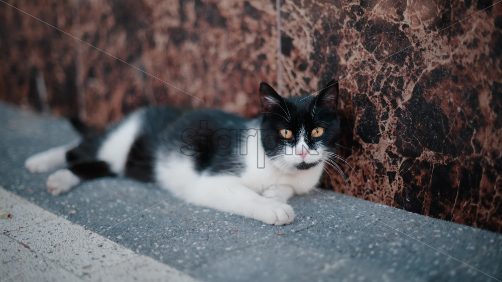 Calm black and white cat lying on a sidewalk, captured in soft daylight tones Royalty Free Stock Video Footage