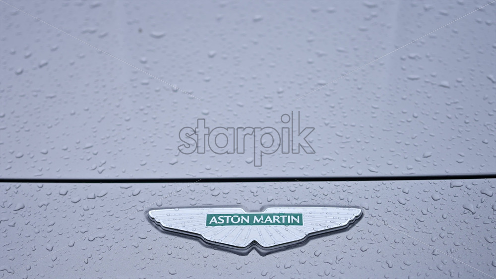 Cannes, France – December 23, 2025: Close up view of an Aston Martin logo on a luxury sports car with rain droplets on the surface Royalty Free Stock Video Footage