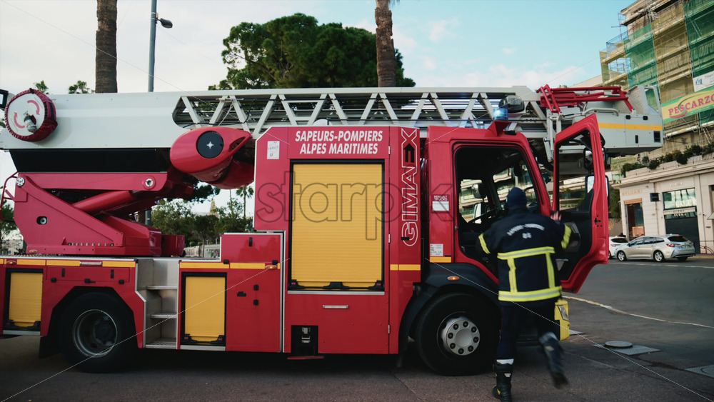 Cannes, France – December 23, 2025: Red fire truck driving along La Croisette with palm trees and pedestrians in the background Royalty Free Stock Video Footage