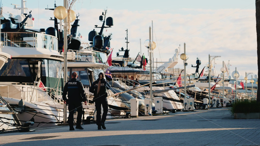 Cannes, France – December 23, 2025: Two uniformed police officers walking along a marina promenade with luxury yachts docked in the background Royalty Free Stock Video Footage