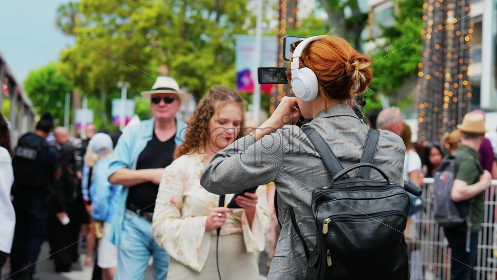 Home » Shop » 1 Video » Video – Cannes, France – May 13, 2025: Woman talking on the microphone in front of a camera at the Cannes Film Festival