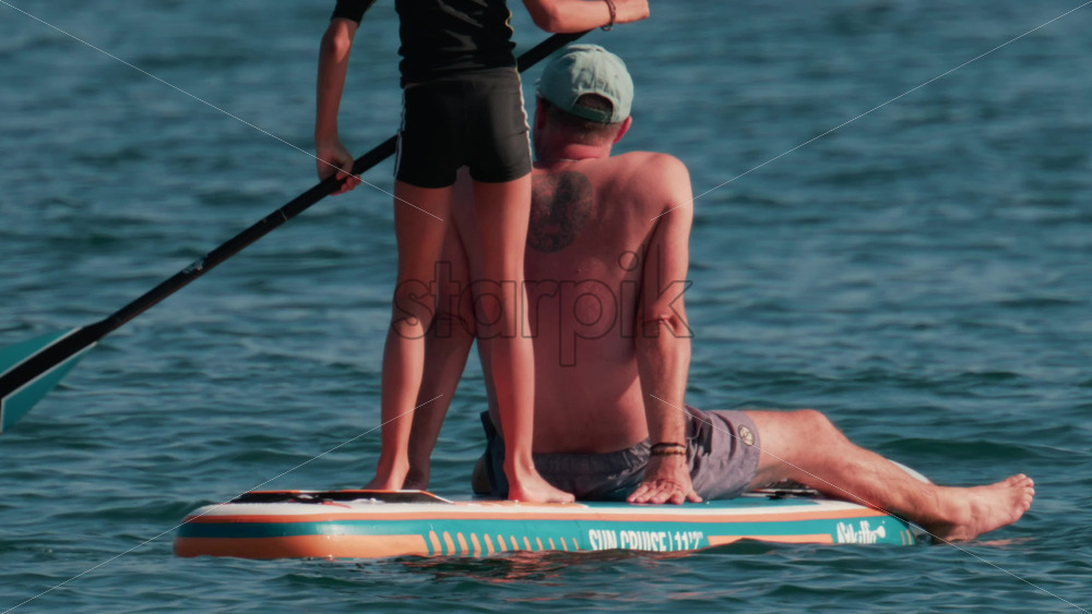 Cannes, France – October 10, 2025: A man sits at the front of a paddleboard while a young child stands and rows at the back Royalty Free Stock Video Footage