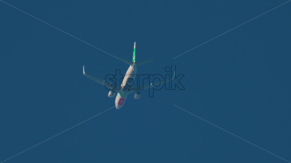 A commercial airplane flying overhead with clear blue sky Royalty Free Stock Video Footage