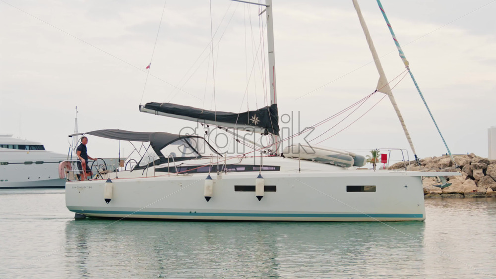 Cannes, France – October 12, 2025: A man steering a white sailboat as it leaves a marina on a calm day Royalty Free Stock Video Footage
