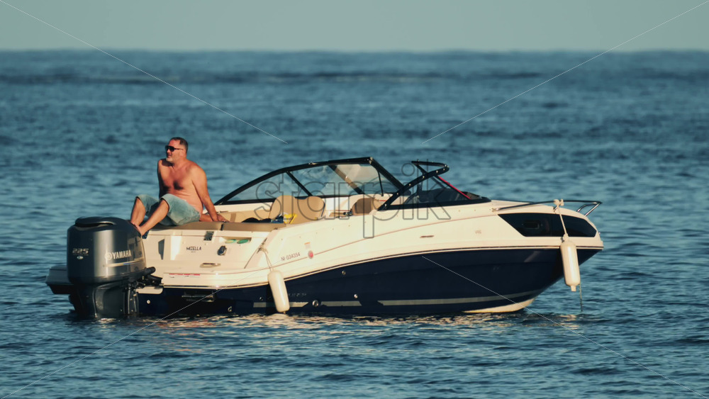 Cannes, France – October 16, 2025: Man lying shirtless on a motorboat floating on calm blue water under sunlight Royalty Free Stock Video Footage