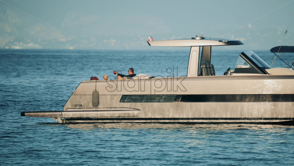 Cannes, France – October 16, 2025: Elegant couple sitting together on the deck of a luxury yacht floating on calm blue sea Royalty Free Stock Video Footage