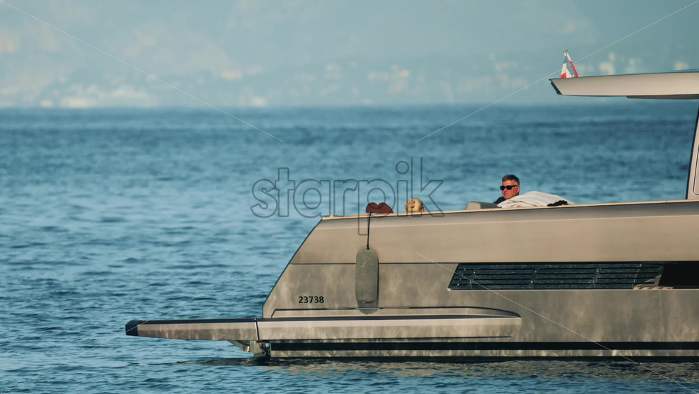 Cannes, France – October 16, 2025: Man lying shirtless on a motorboat floating on calm blue water under sunlight Royalty Free Stock Video Footage