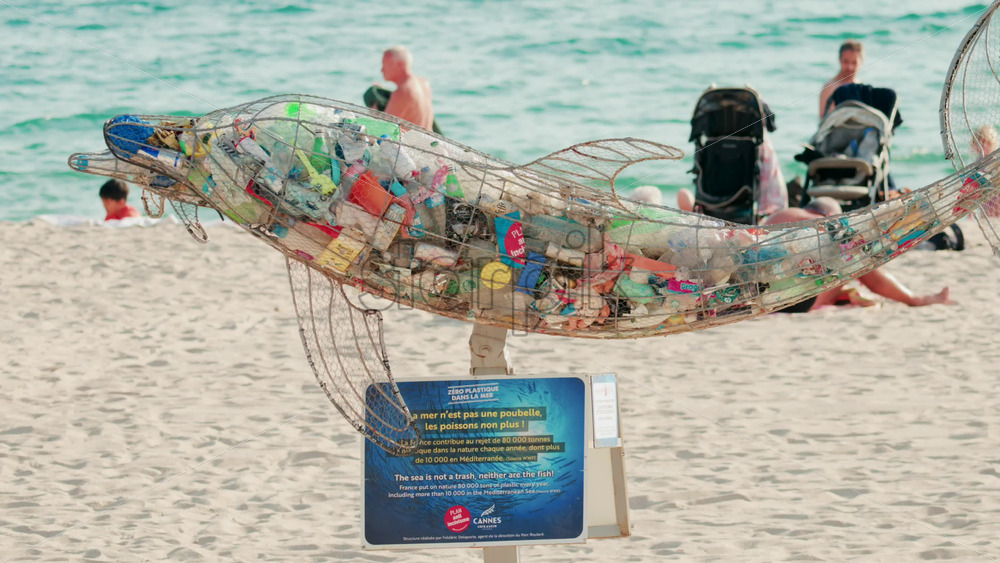 Cannes, France – October 4, 2025: Metal dolphin sculpture filled with plastic waste displayed on a sandy beach by the sea, raising awareness about ocean pollution Royalty Free Stock Video Footage